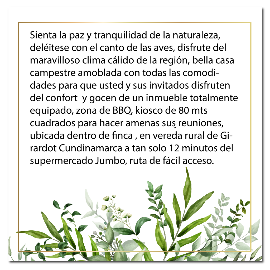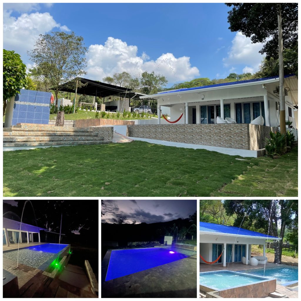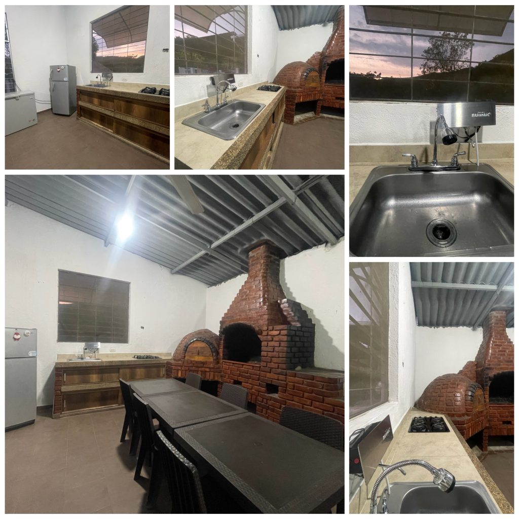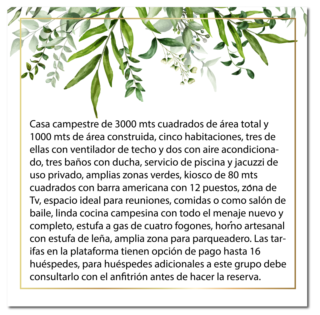 Piscina sin fin ideal para niños y adultos.Piscina con chorros recreativos y luces de colores nocturnas, amplio jacuzzi para 16 personas.Kiosco de 90 mts cuadrados, amplia sala tipo L, mesón con barra americana de 3mts, televisor de 60 pulgadas con señal satelital con más de 80 canales. Espacio ideal para reuniones, eventos y pista de baile.Cómodos patios exteriores.habitación 1: Cama doble y cama auxiliar matrimonial pequeña, tv de 32 pulgadas con servicio de aire acondicionado.Habitación 2: Cama semidoble y dos camas sencillas una de ellas tipo nido, servicio de aire acondicionado.Habitación 3: Habitación principal con baño privado, servicio de tv, cama matrimonial doble con nido auxiliar semidoble, ventilador de techo.Habitación 4: Dos camas sencillas con ventilador de techo.Habitación 5: Cama matrimonial pequeña y cama sencilla con ventilador de techo.Hermosa cocina campesina con estufa a gas, horno y estufa de leña, totalmente dotada para preparar y servir alimentos, gran variedad de electrodomésticos nuevos a disposición del huésped.Tres baños en total, con ducha y división en cristal.Amplia zona de parqueadero