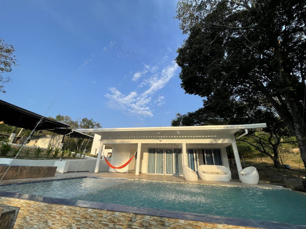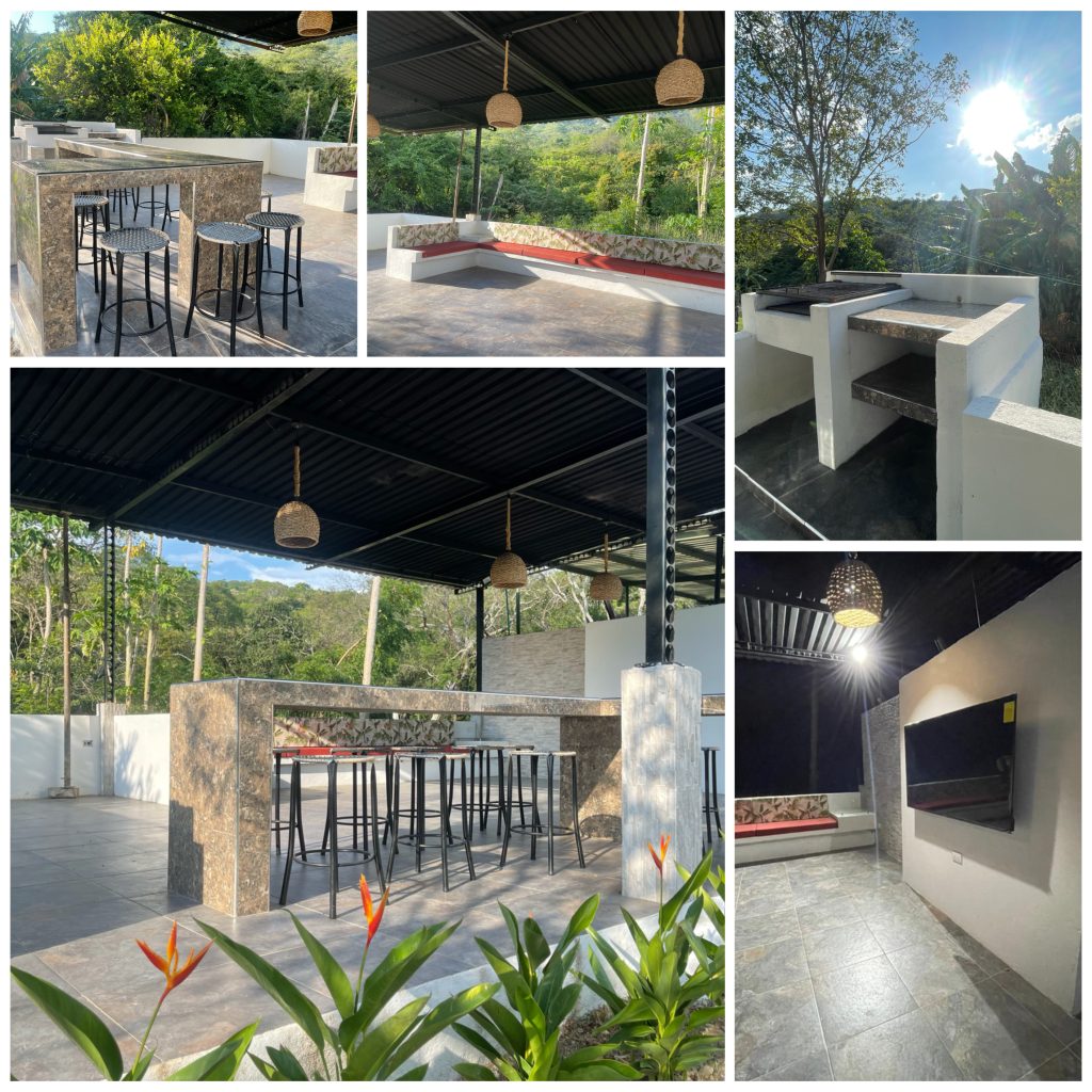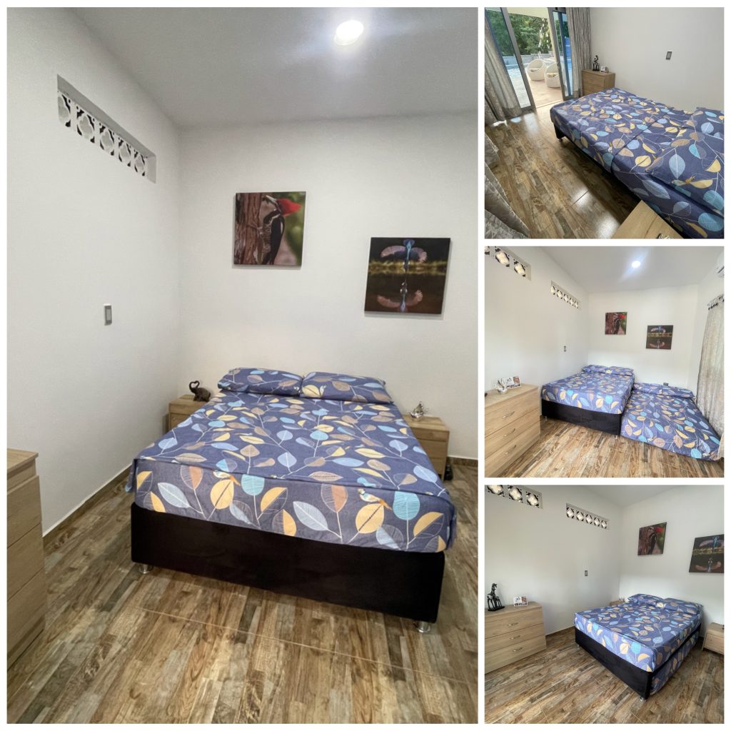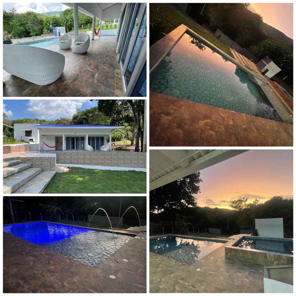 Piscina sin fin ideal para niños y adultos.Piscina con chorros recreativos y luces de colores nocturnas, amplio jacuzzi para 16 personas.Kiosco de 90 mts cuadrados, amplia sala tipo L, mesón con barra americana de 3mts, televisor de 60 pulgadas con señal satelital con más de 80 canales. Espacio ideal para reuniones, eventos y pista de baile.Cómodos patios exteriores.habitación 1: Cama doble y cama auxiliar matrimonial pequeña, tv de 32 pulgadas con servicio de aire acondicionado.Habitación 2: Cama semidoble y dos camas sencillas una de ellas tipo nido, servicio de aire acondicionado.Habitación 3: Habitación principal con baño privado, servicio de tv, cama matrimonial doble con nido auxiliar semidoble, ventilador de techo.Habitación 4: Dos camas sencillas con ventilador de techo.Habitación 5: Cama matrimonial pequeña y cama sencilla con ventilador de techo.Hermosa cocina campesina con estufa a gas, horno y estufa de leña, totalmente dotada para preparar y servir alimentos, gran variedad de electrodomésticos nuevos a disposición del huésped.Tres baños en total, con ducha y división en cristal.Amplia zona de parqueadero